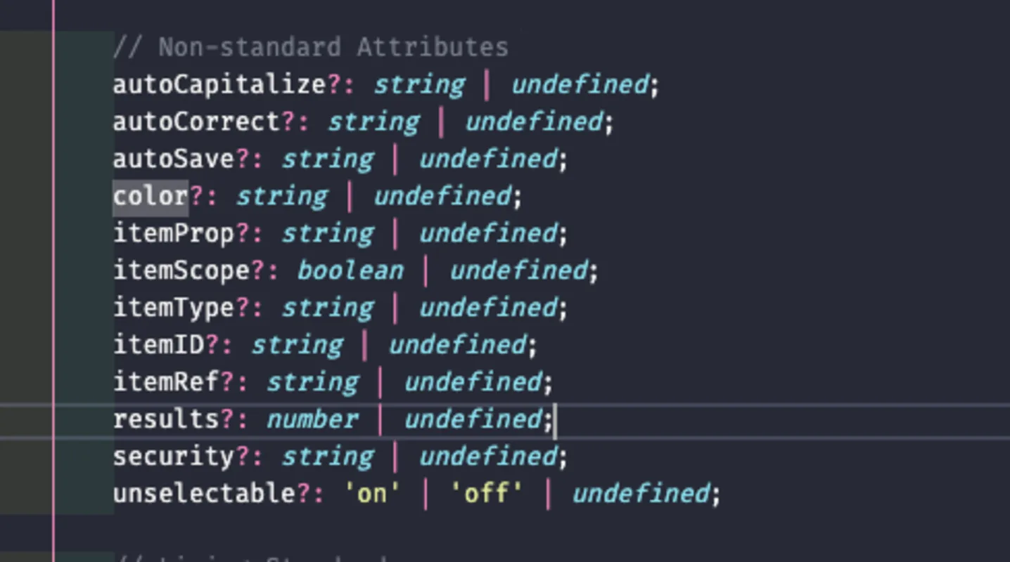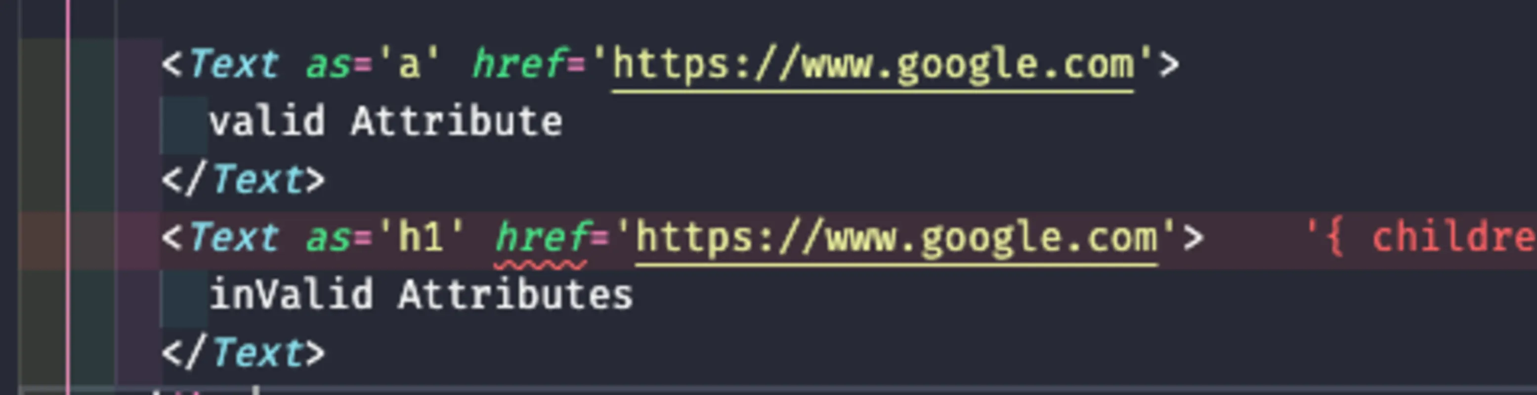 이제 올바른 attribute 만 사용 가능하고, 올바르지 않을 경우 타입스크립트가 오류를 만들어 냅니다.