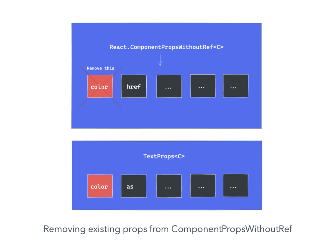 type TextProps<C extends React.ElementType> = { as?: C; color?: "black" | "red"; }; type Props<C extends React.ElementType> = React.PropsWithChildren< TextProps<C> > & Omit<React.ComponentPropsWithoutRef<C>, keyof TextProps<C>>;